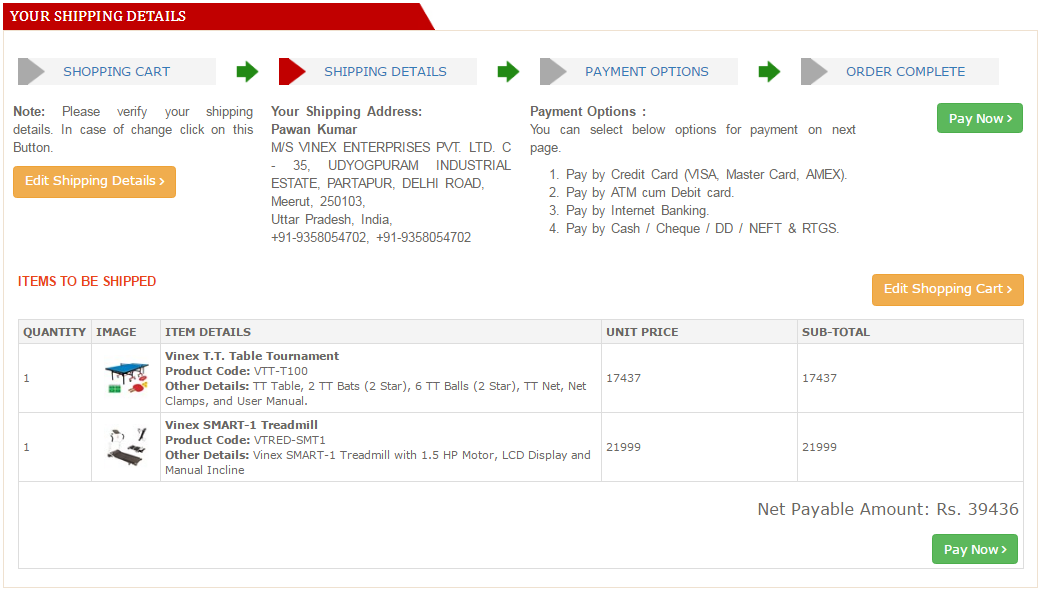 After the completion of your Login or Sign Up process you will be redirected to "Shipping Details" page. Check your Shipping Details at this point and make changes if necessary. When you are ready, click on "Pay Now" button.