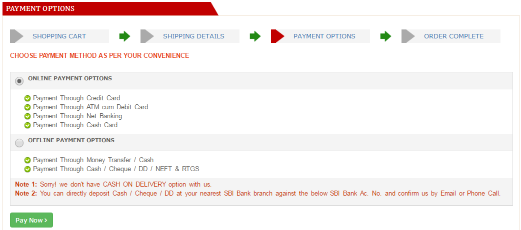 You will find it to be quick and easy to make order online. If you want to order online, you can submit your order by using our shopping cart system. Acceptable payment methods are Credit Cards, ATM cum Debit Cards, Net Banking for Online Payment and Cheque, Cash, DD for Offline Payment. You can also register your order online and make payment later by Online and Offline Payment method. To order online you have to follow these steps -